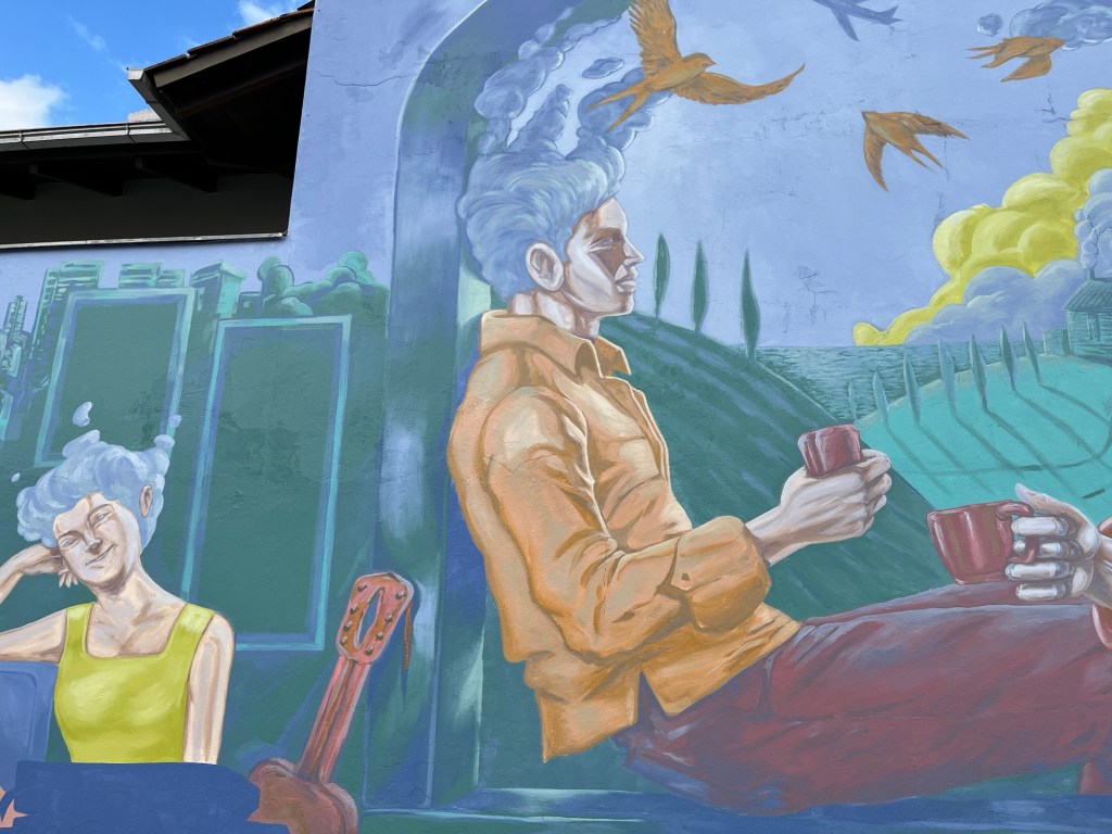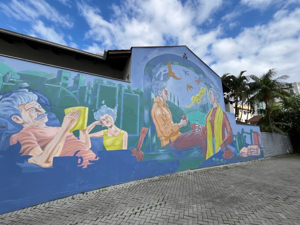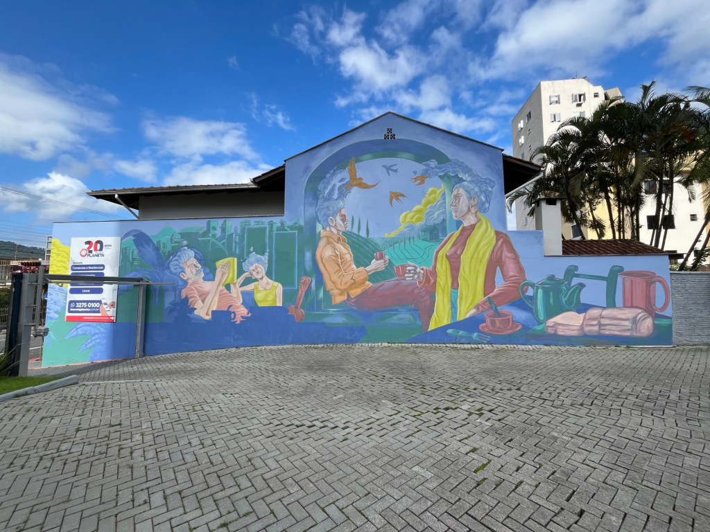 Este é o mural que desenvolvi para a Imóveis Planeta, uma empresa tradicional aqui de Jaraguá do Sul. O objetivo era criar uma arte gigante que não apenas celebrasse a história da empresa, mas que também refletisse o valor que ela oferece aos clientes.